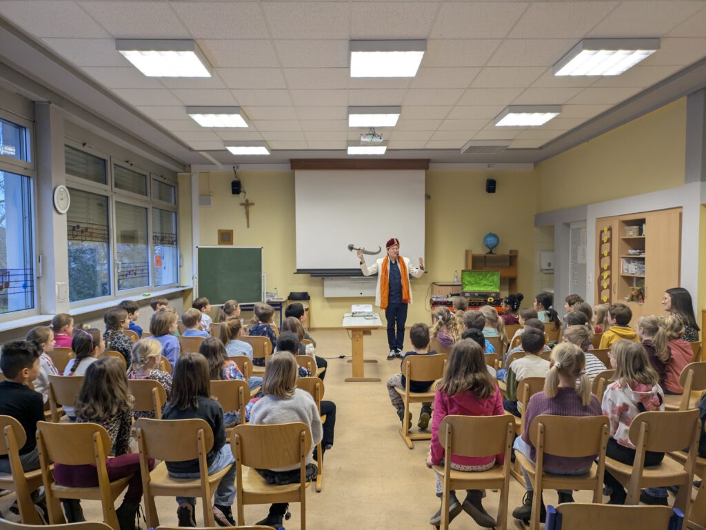 Am Montag, den 2. Februar 2026, herrschte in der Grundschule Weiher eine ganz besondere Aufregung, denn der bekannte Kinderbuchautor TINO war zu Gast. In einer mitreißenden Lesung zog er die Schülerinnen und Schüler der Klassen 1 bis 4 in seinen Bann. Anstatt nur vorzulesen, gestaltete TINO den Vormittag so lebendig, dass die Geschichten förmlich im Raum schwebten. Mit seiner humorvollen Art und einer beeindruckenden stimmlichen Vielfalt sorgte er für viele Lacher und begeisterte Gesichter im Publikum.