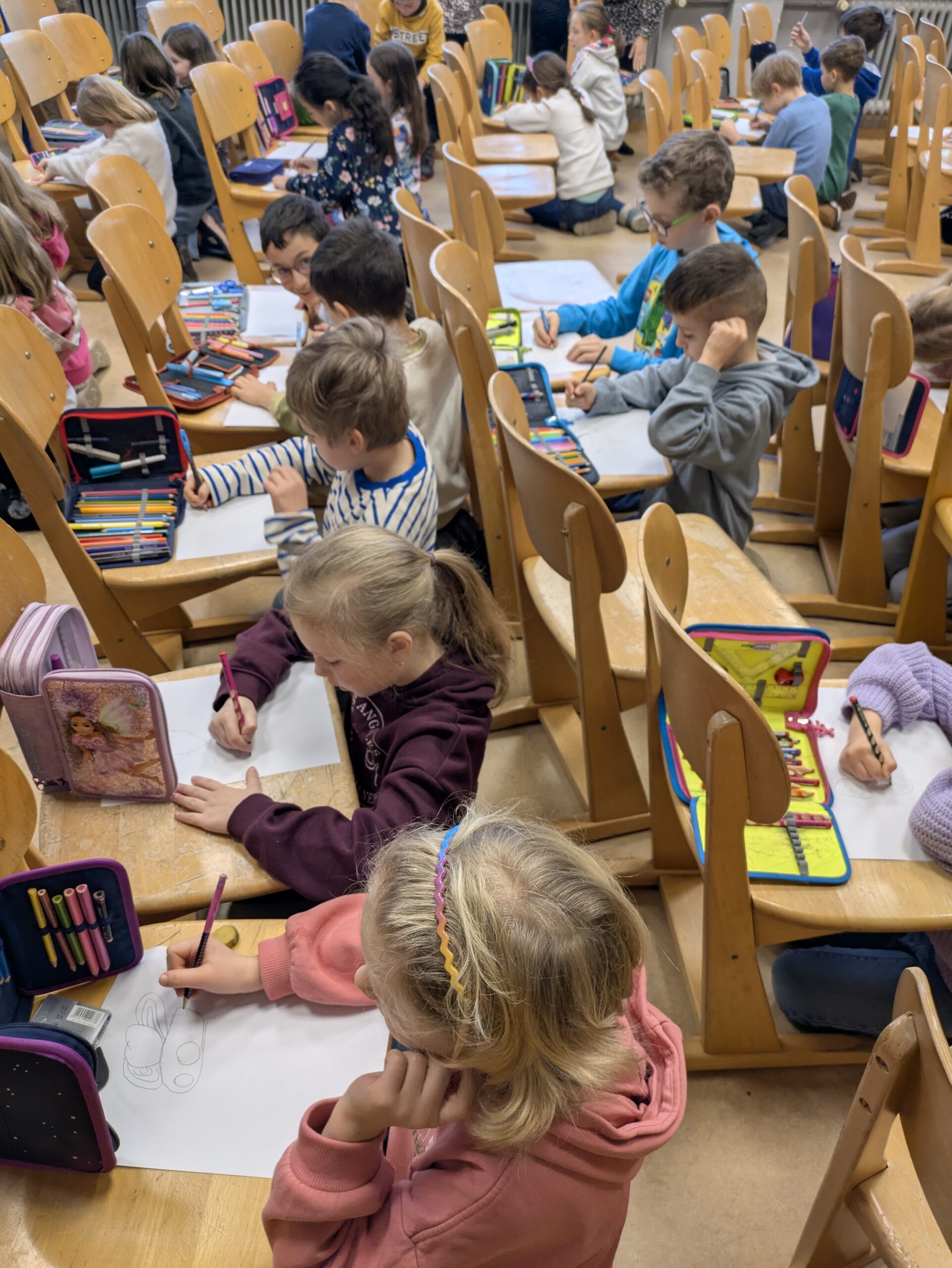 Im Anschluss an die Leseproben hatten die Kinder die Gelegenheit, den Gast persönlich kennenzulernen. Mit großer Neugier stellten sie zahlreiche Fragen zum Beruf des Autors und wollten genau wissen, wie seine Bücher entstehen. Ein besonderes Erlebnis war der kreative Teil des Vormittags: Unter Anleitung von TINO lernten die Kinder, wie man aus einfachen geometrischen Formen lustige Fantasietiere erschafft. Inspiriert von diesen Tipps griffen die Schüler selbst zum Stift und ließen ihrer eigenen Kreativität freien Lauf.