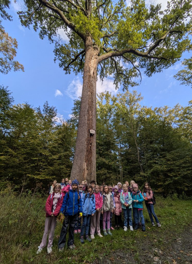 „Unser Waldtag am 1.10. Ich finde es sehr schön, dass wir die Kramer Eiche besucht haben. Sie ist 35 m hoch und 400 Jahre alt.“ Maria