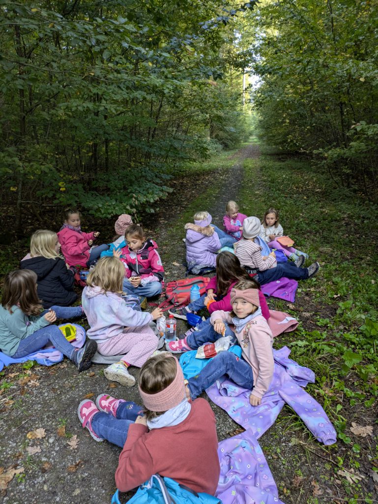 „Unser Waldtag am 1.10. Wir hatten Glück, dass tolles Wetter war. Wir haben die große Kramer Eiche gesehen, die 35 m hoch ist und 400 Jahre alt. Wir haben Eicheln, Bucheckern und Pilze gesehen.“ Clara